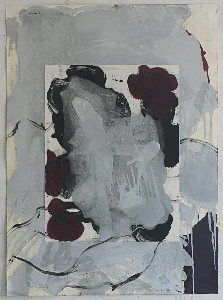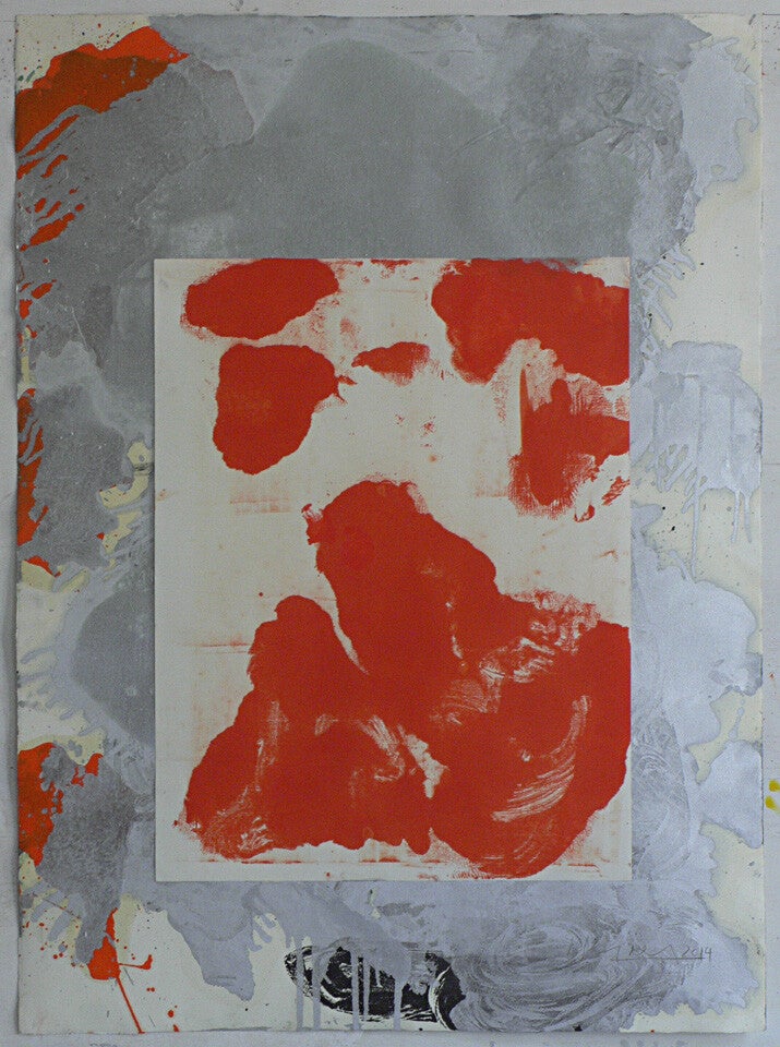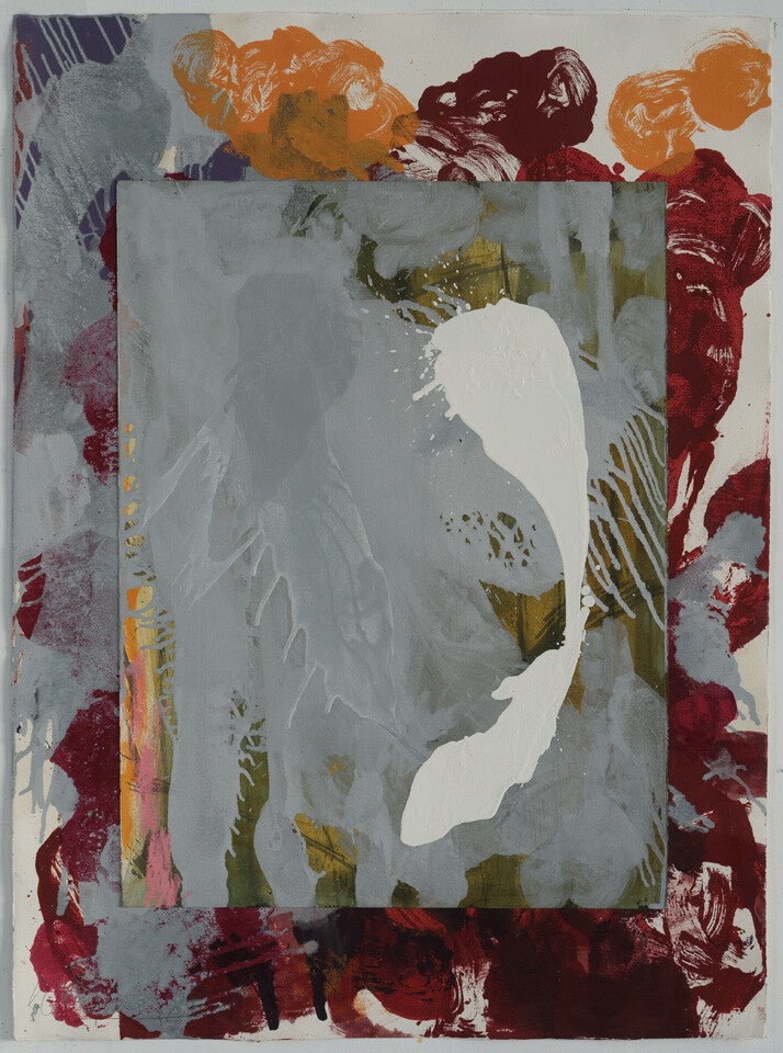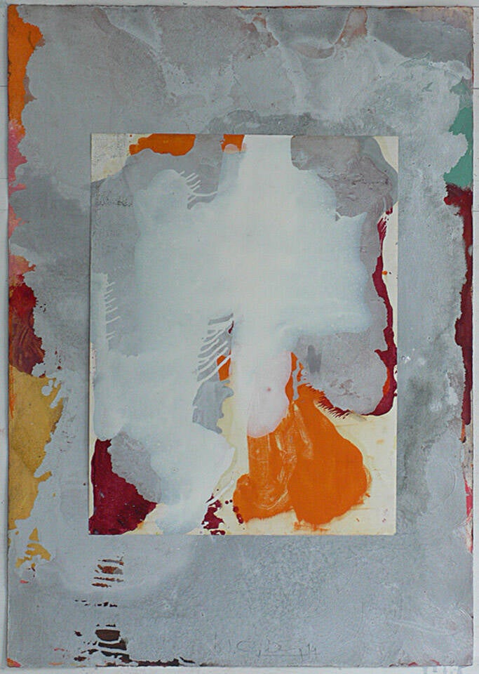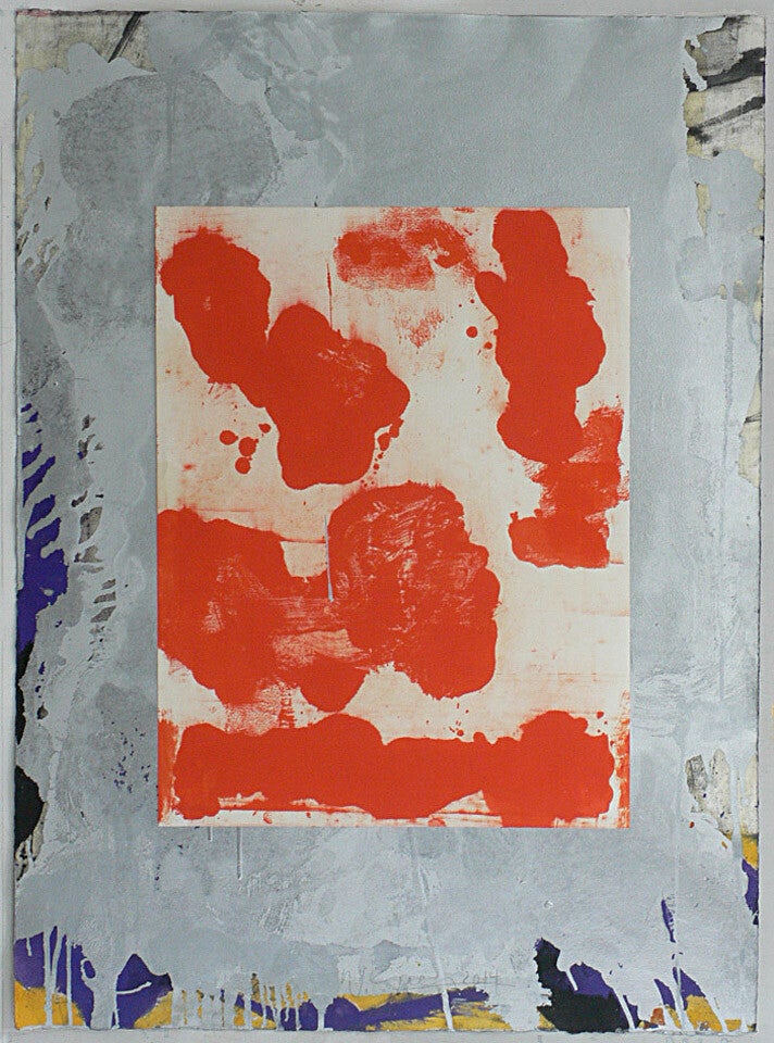 In den mittig aufgelegten Bildern der Serie findet sich Formensprache der darunter gelegten Bilder wieder, wenn die Farbunterschiede zwischen beiden Ebenen eher schwächer sind und es Überlappungen von innerem und äußerem Bild gibt. Sind die Farbunterschiede jedoch stark – durch Verwendung roter Farben -, so gewinnt das innere Bild eine eigene Körperlichkeit. Das provoziert eine Form der Aufmerksamkeitslenkung, einen Effekt kontrastierender Fokussierung.