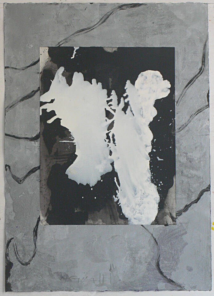 " Die Werkgruppe macht existentielle Antagonismen durch Bild-In-Bild-Komposition unübersehbar augenfällig; sie überlagert zwei Bilder auf separatem Papier; das hintergründige Bild wird zu einem breiten Rahmen für das mittig aufgelegte vordergründige. Die Kontraste ergeben sich nicht allein materialiter durch die beiden aufeinander liegenden Blätter, sondern auch durch Farben und Formen. Im zugrunde gelegten Rahmen finden sich vorwiegend grau-blaue, voluminöse Formen; sie werden an den Rändern durch schwarze, fleckenartige Körper begrenzt. Auch lässt sich ein blasses Gelb erkennen. Vor diesem Hintergrund wird der erste Teil Titelgebung – Frostfeuer – evident: Es geht um Antagonismen durch Oxymora. Da erinnert sich der Philologe daran, dass das deutsche Adjektiv kalt mit dem lateinischen calidus (= heiß) die gleiche indoeuropäische Herkunftswurzel teilt.