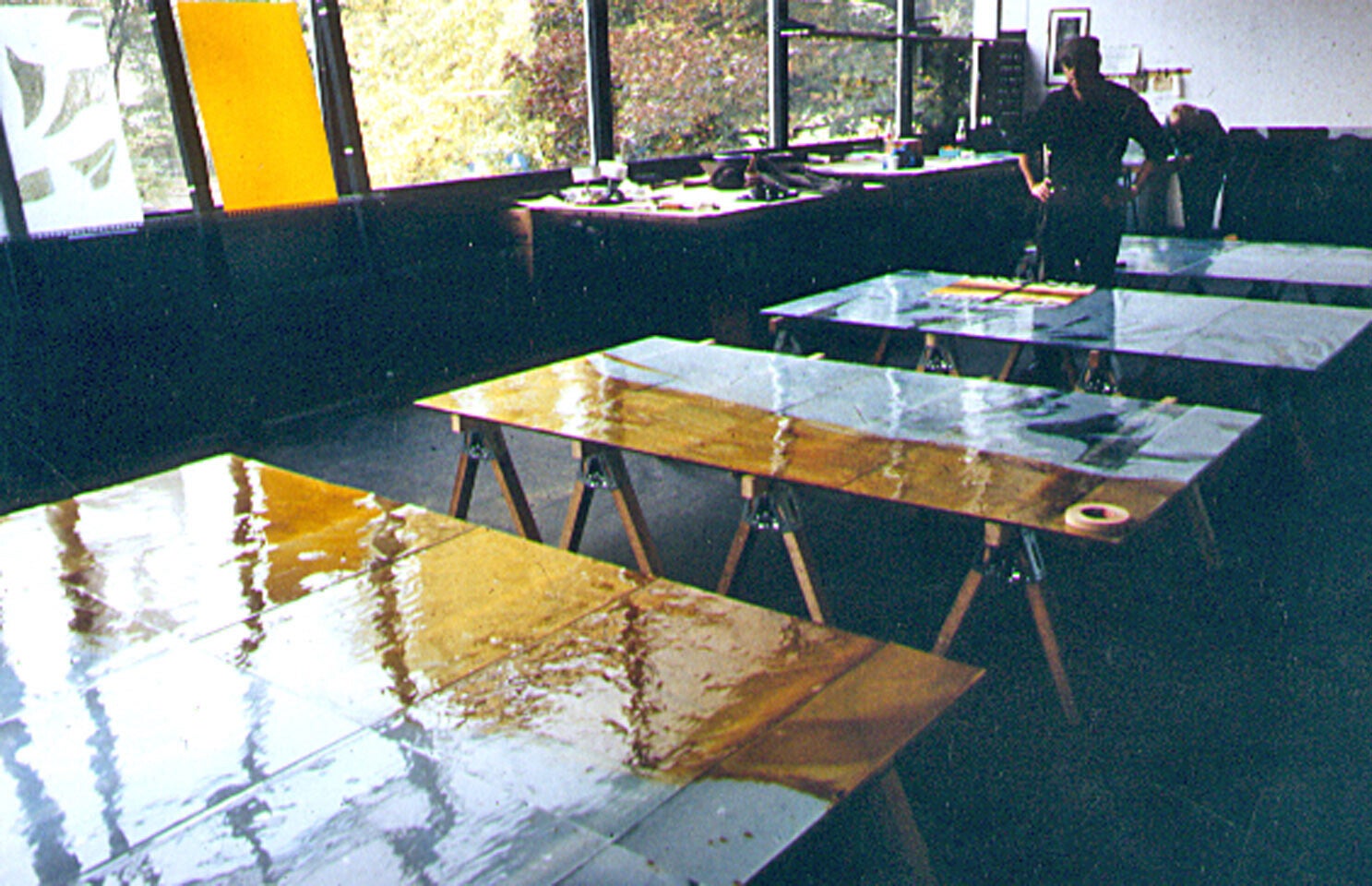 Fenster für Edith-Stein-Kirche während der Ausführung in der Glaswerkstätte Derix, Kaiserswerth, 1992