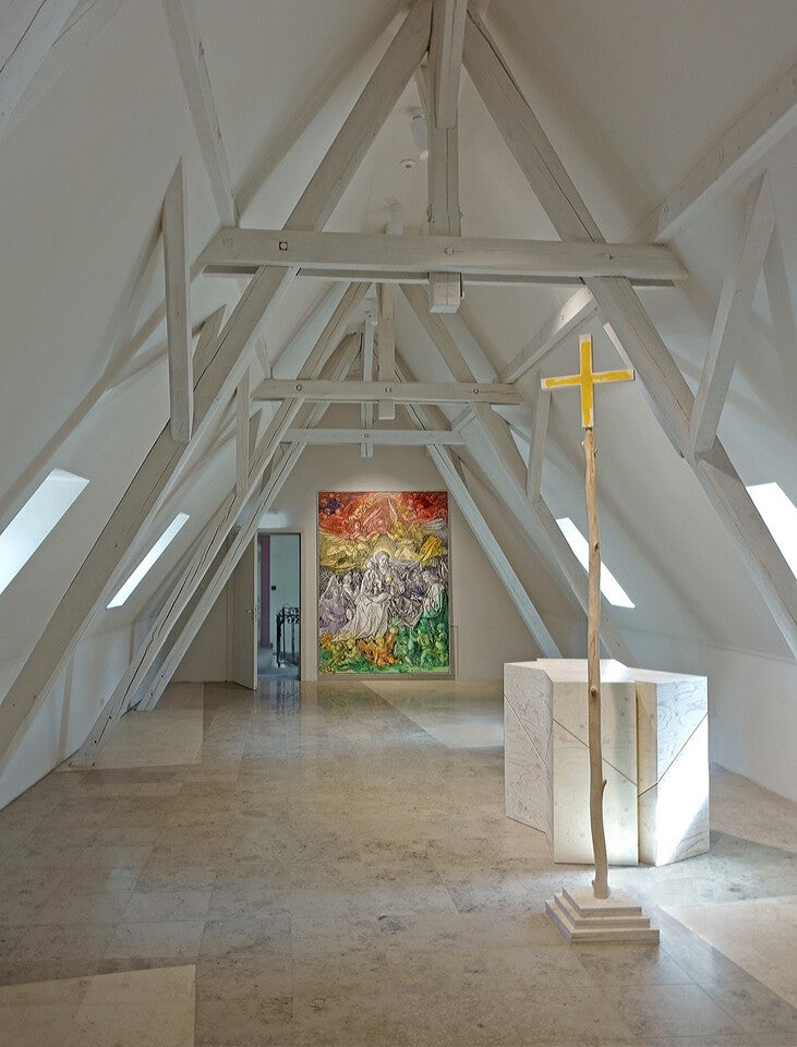 Ausschlaggebend für die Konzeption einer „Wegkapelle“ war die Örtlichkeit: Der historische, langgestreckte Raum unter dem Dach mit offenem Gebälk. Der alte Trakt verbindet den Neubau mit dem historischen Baukörper des Hotels. In Erinnerung an die volkstümlichen Bildstöcke am Wegesrand in den Weinbergen wurden in die beiden Giebelwände Darstellungen von Christophorus (Schutzpatron der Reisenden) und Maria eingepasst. Basis für die Wandbilder sind Dürers sog. Brot und Butter - Druckgrafiken von 1501 und 1518. Die Holzschnittdrucke wurden horizontal gespiegelt (so dass die dynamischere Ausgangskomposition auf den Druckstöcken erlebbar wird), in Wandbildgröße auf Leinwand gedruckt und dann mit Ölfarbe überarbeitet. Die Bodengestaltung kennzeichnet den Weg von Tür zu Tür mit einem dunkleren Steinbelag. Die Form des Altars soll in alle Richtungen des Raums hineinwirken. Das Material – einfaches Kistenschichtholz. Das 2,70 m hohe Stabkreuz aus Birkenholz steht in einer Basis aus sieben Steinschichten. Das Priestergewand zeigt das Motiv der Weintrauben in Originalgröße aus dem Wandbild der Marienkrönung.